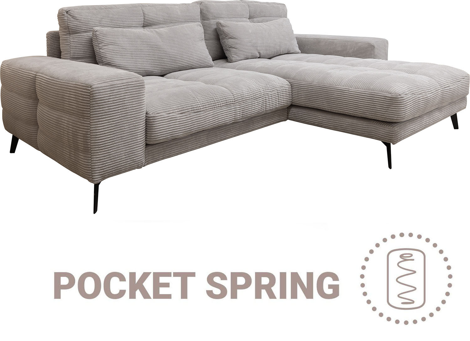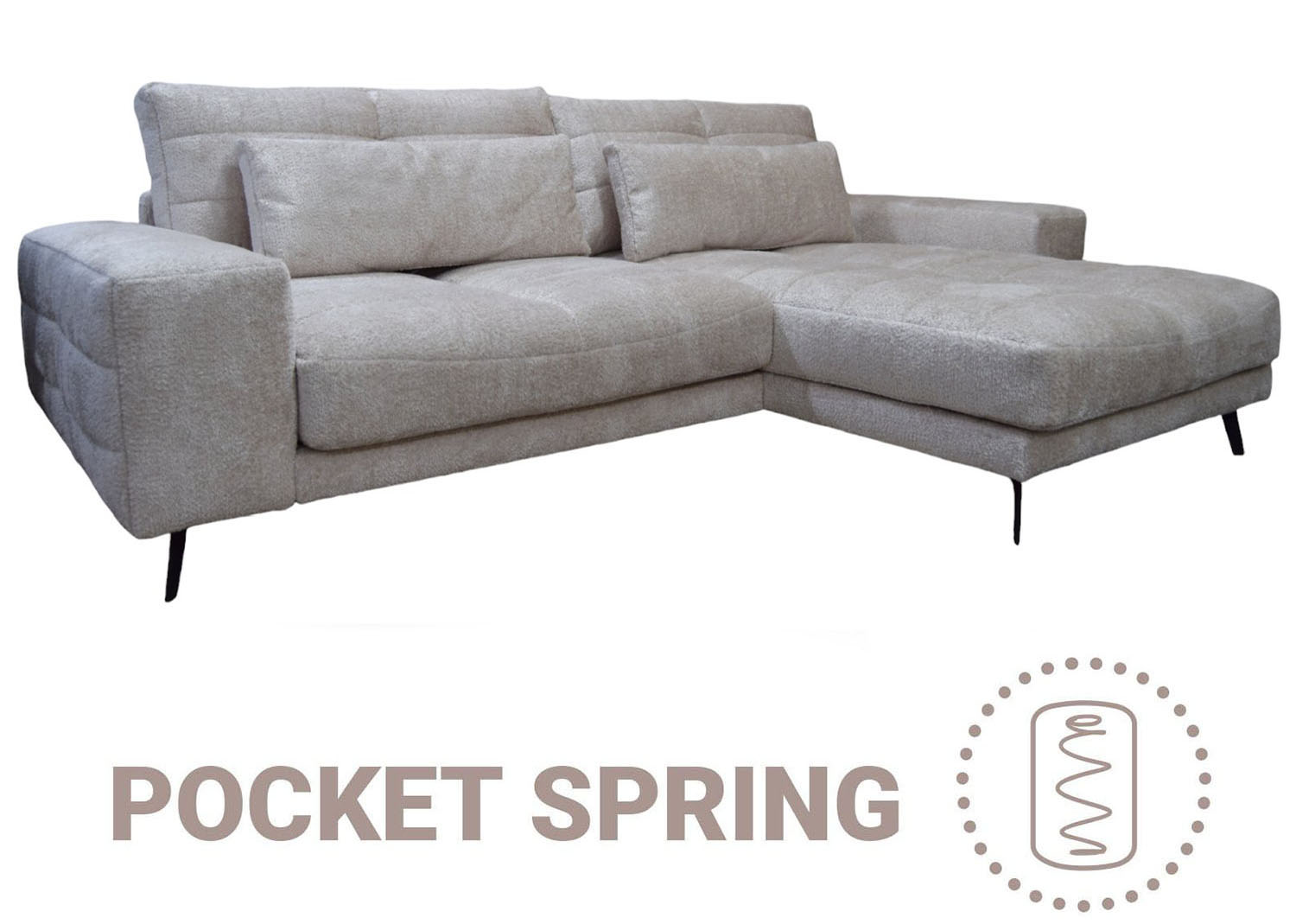 Диван дополнен декоративными подушками с наполнителем «Soft+», а его широкие подлокотники делают отдых еще приятнее. Стильные металлические опоры высотой 15 см добавляют эстетики и легкости в интерьер, подчеркивая современный вид модели и позволяя легко поддерживать чистоту под диваном.